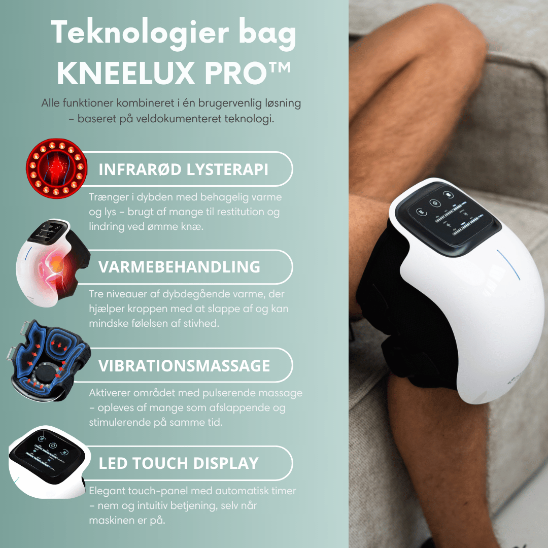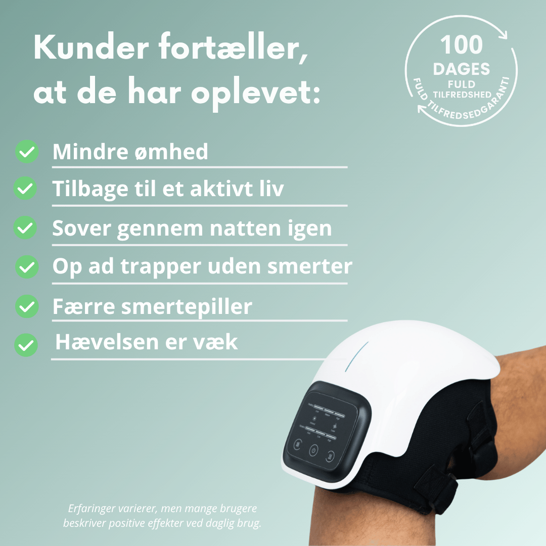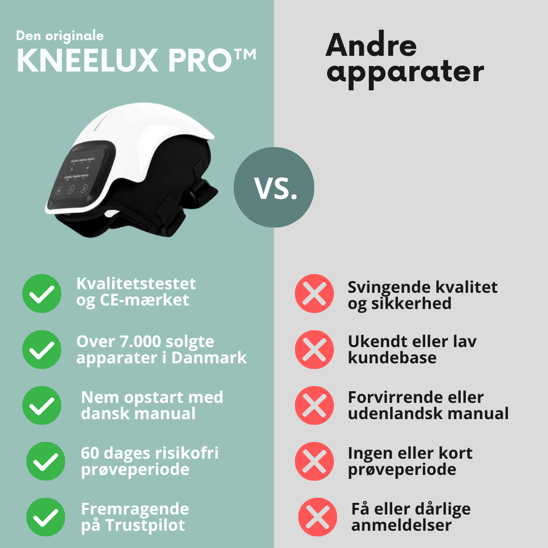 Der findes efterhånden mange knæmassagere på markedet, men de er ikke identiske med KNEELUX PRO™ – heller ikke hvis de ligner. Hverken i opbygning, tilpasning eller den samlede oplevelse. Når du vælger KNEELUX PRO™, får du også uovertruffen dansk support, førsteklasses vejledning så du er godt klædt på og en tilfredshedsgaranti, som giver dig den tryghed du skal bruge, når du kaster dig over noget nyt.