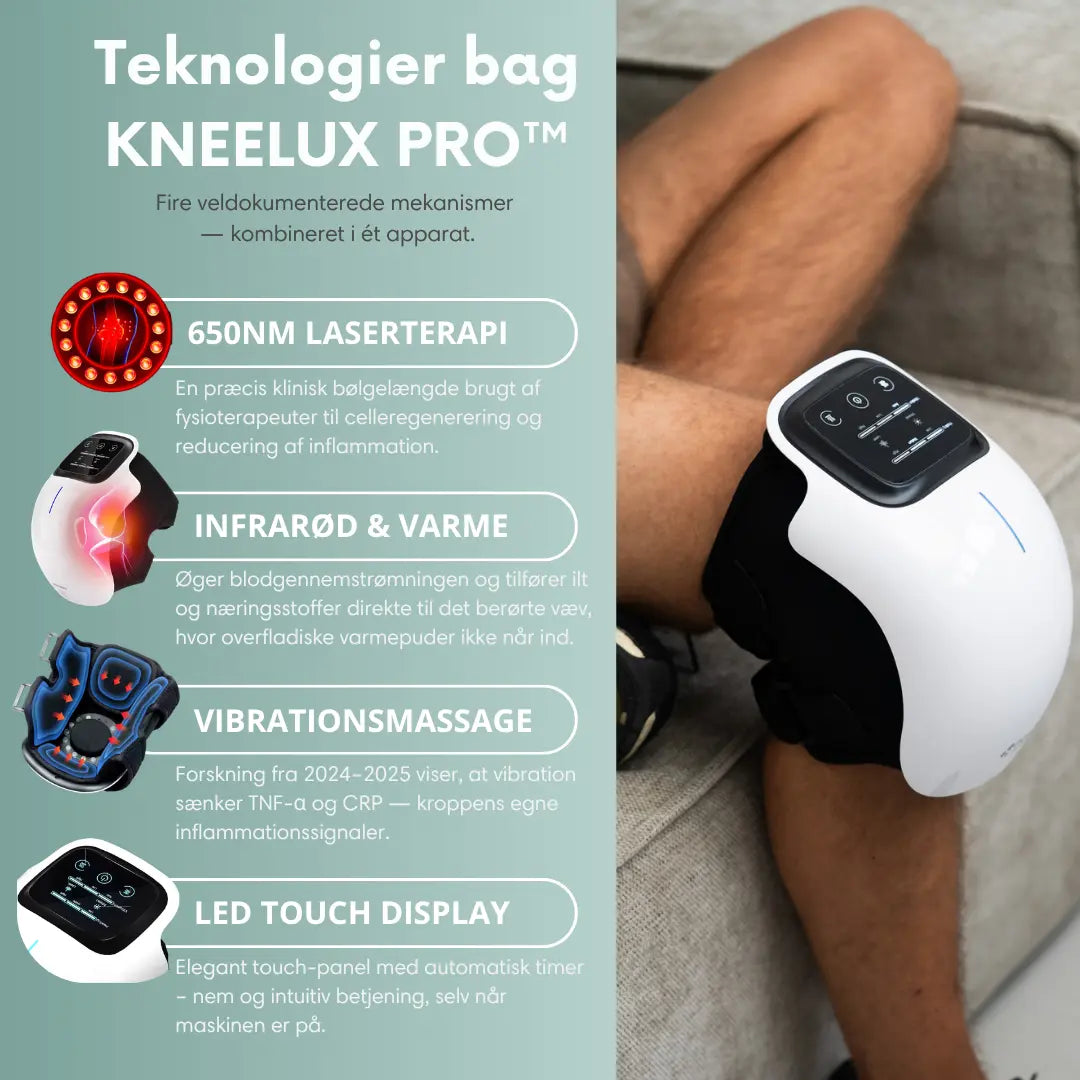 Vi forhandler den originale KNEELUX PRO™ som i dag den mest solgte knæmassager i sin kategori i Danmark. Siden lanceringen har produktet været løbende videreudviklet på baggrund af feedback fra tusindvis af kunder og aktiv brug i hverdagen.